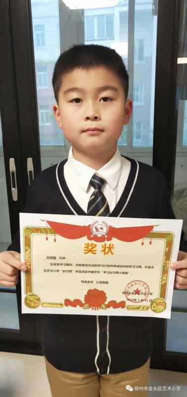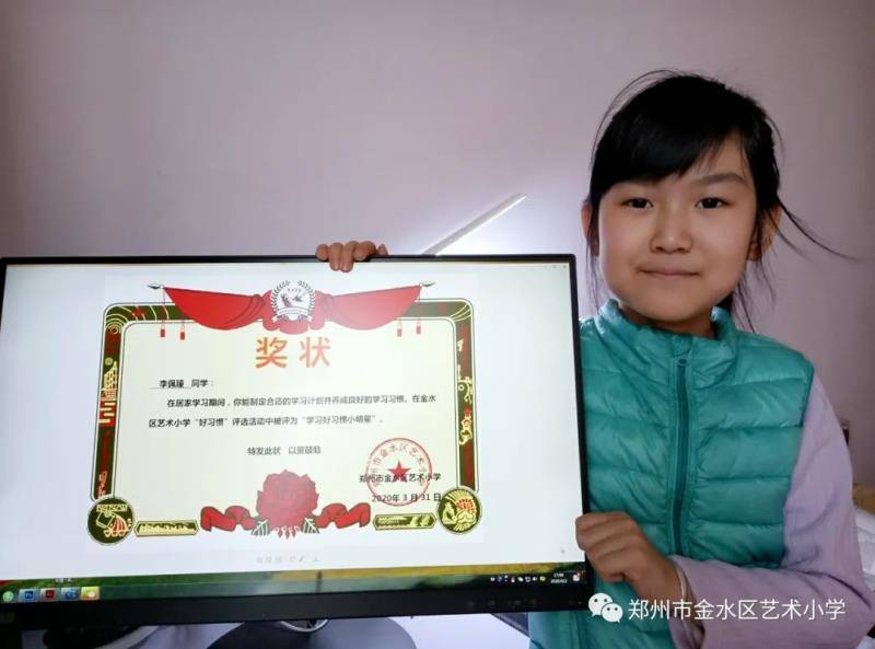 为了鼓励“停课不停学”这段时间养成良好习惯的孩子们,树立一批优秀学生起到模范带头作用,金水区汇彩网于3月底开展了“好习惯小明星”评选活动,分别从“学习习惯小明星”、“生活习惯小明星”、“艺术养成习惯小明星”三个方面进行评选。学生先根据好习惯申请表中的内容进行自我反思,自评合格者可填写申请表进行评选申请,然后各班班主任及音美教师根据申请情况、结合学生平时上课表现、作业情况等,评出好习惯小明星若干名。在这特殊的日子里,学校特意制作了电子奖状,一份份奖状通过网络桥梁,发到过奖学生的手中。