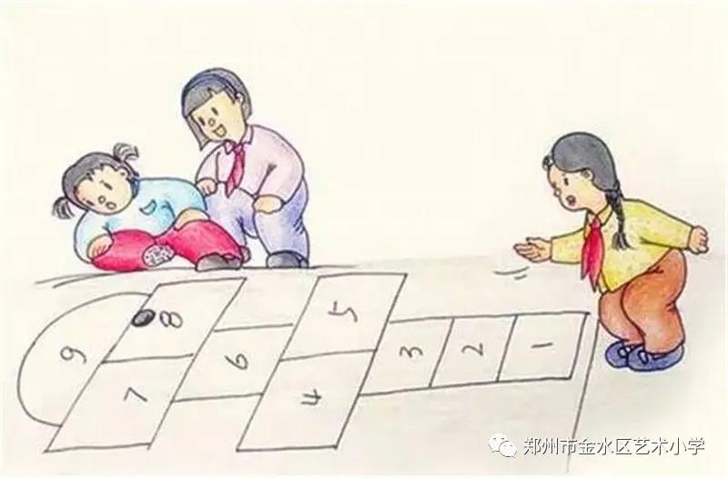 玩法:先在地上画好格子,拿一块扁平的物体(沙包、纽扣、玩具等),将其掷入其中一个方格,如果石头触线或越格就算输;跳过除了有石块的其他方格,只能单脚跳,除非两个方格并列,踩线、跳错格或跳到格子外都算输;跳回来时捡起石子,从1跳到最后一个数字,然后返回,到达有石子的方格时,捡起石子越过方格。
