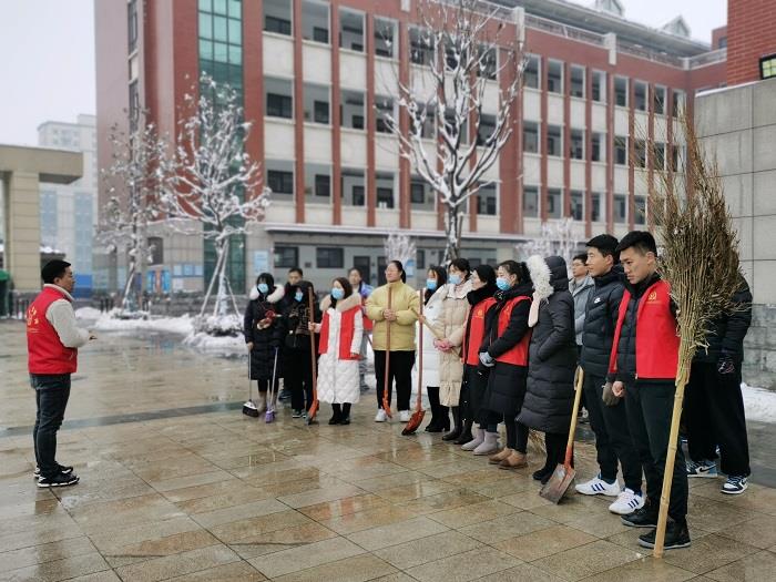 1月5日一大早,第三支部的党员教师们如约来到金科校园,有序组织住读生回家。之后在支部书记郑磊勇同志带领下,党小组成员和教师们手拿铁锹、笤帚清扫校园的积雪,大家脱衣挽袖,铲的铲,扫的扫,干得热火朝天……在扫雪的过程中,不断有自发而来的老师加入,使大家倍受鼓舞,齐心聚力。热火朝天的劳动场面让严寒的天气也显得暖意浓浓。