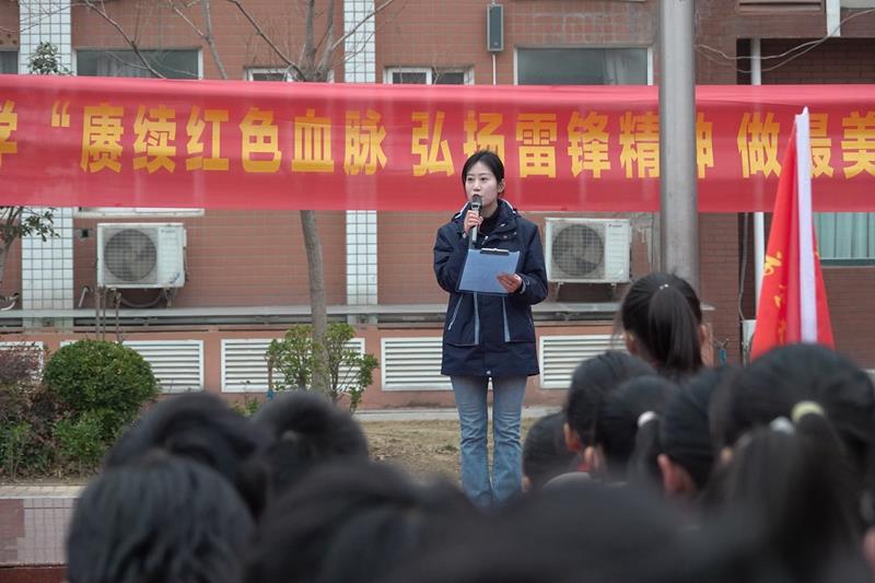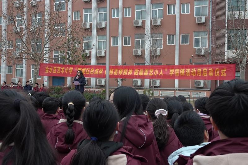 晨曦初露,歌声飘扬。学校操场上,同学们精神抖擞,鸦雀无声,五星红旗在雄壮宏亮的国歌声中冉冉升起,在阳光的照耀下熠熠生辉。学校副书记郭莹为活动致辞,希望同学们从现在做起,从小事做起,像雷锋叔叔那样学习和生活;希望全体教职工用雷锋精神治校育人,帮助学生在一个充满文明和关爱的校园环境中健康成长,更好地成人、成才。