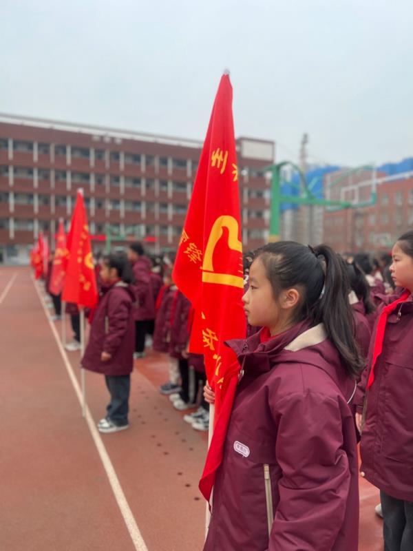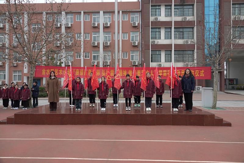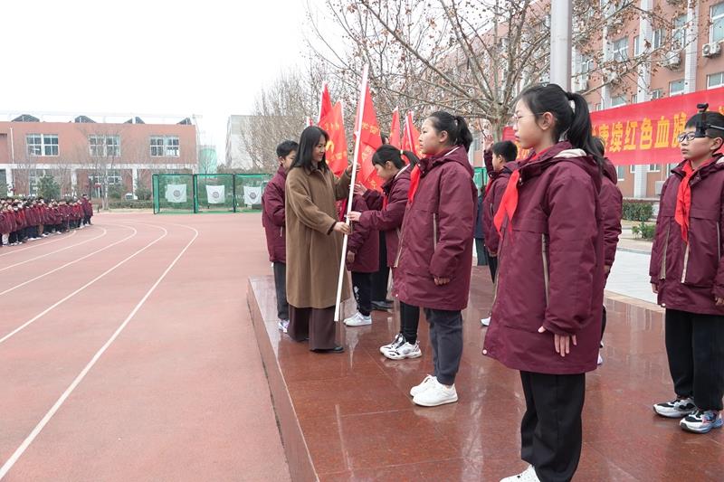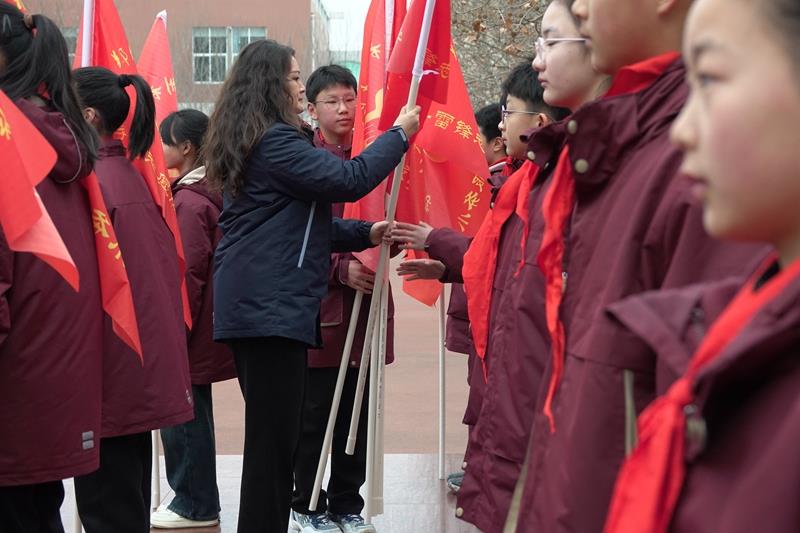 学校副书记郭莹、副校长杨丽丽为各中队授“学雷锋志愿服务”队旗。一面面鲜艳的队旗迎风招展,星星火炬在雷锋精神的指引下闪闪发光。相信全校队员都能从生活中的点点滴滴做起,用实际行动诠释雷锋精神的内涵,将雷锋精神发扬光大。