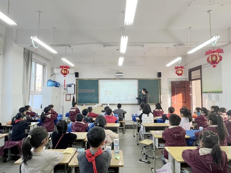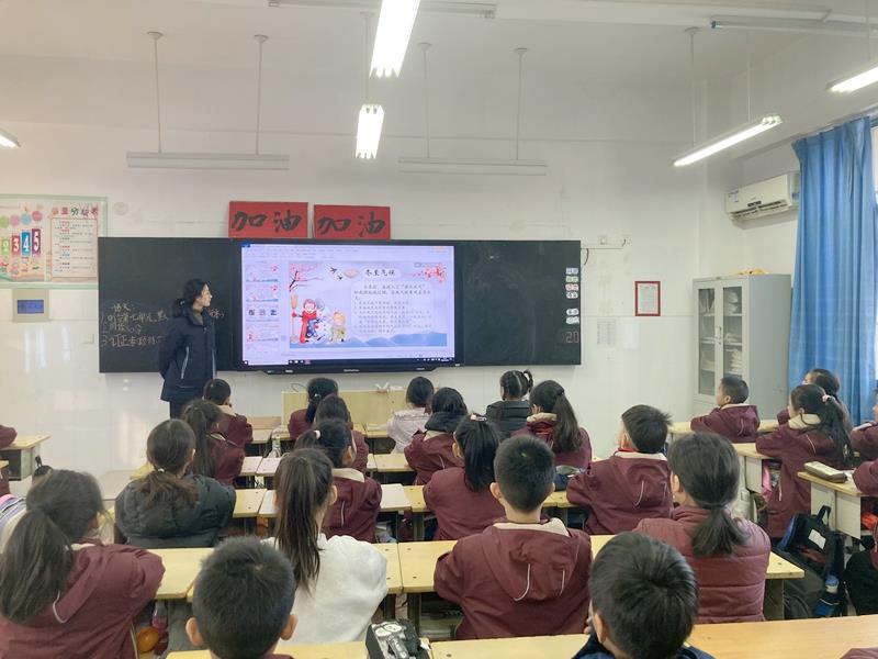课堂上,中队辅导员老师利用图片、视频等多媒体方式,向同学们依次介绍了冬至的历史由来、冬至的习俗、冬至如何养生、冬至诗词等,同学们坐得端正、听得认真,在良好的氛围环境中,聆听老师娓娓道来的述说,了解冬至节日,传承冬至文化。