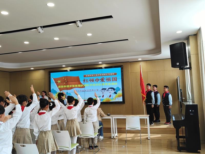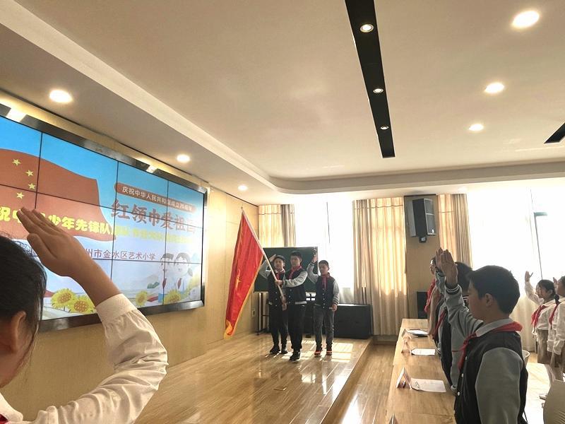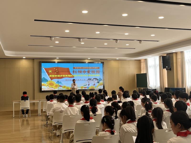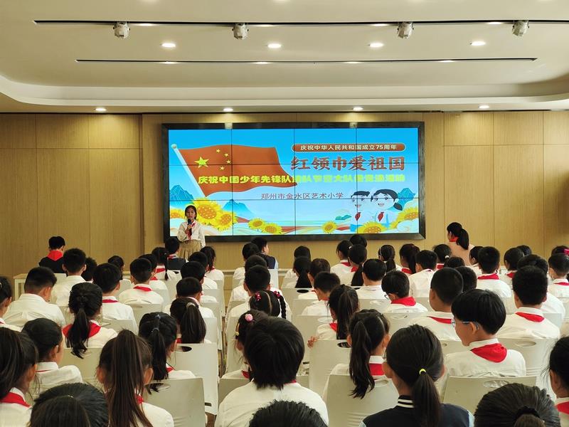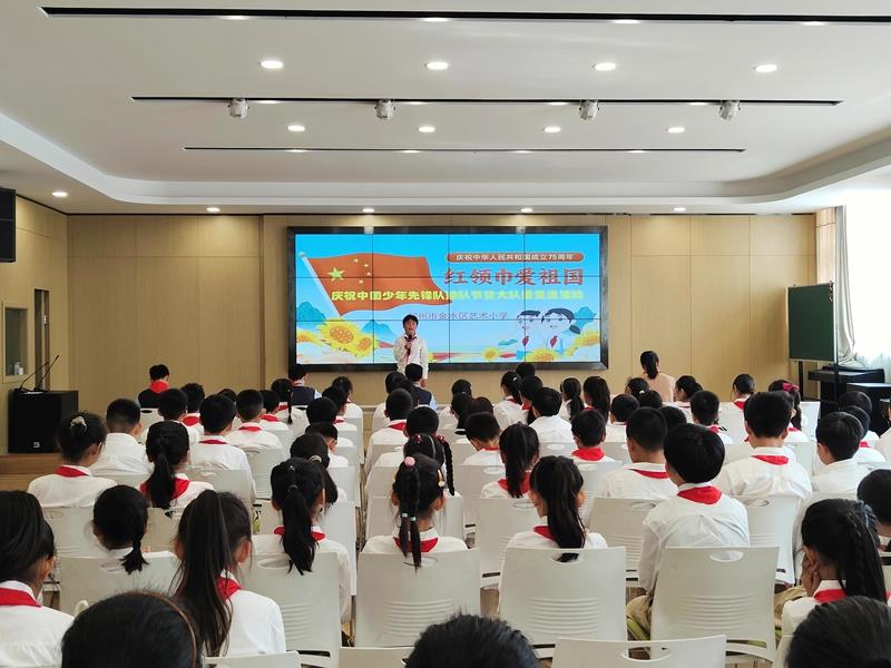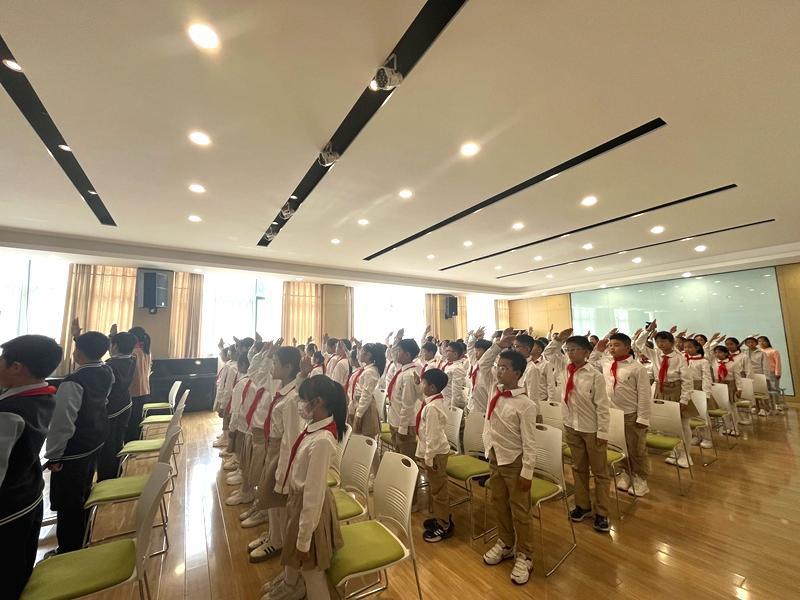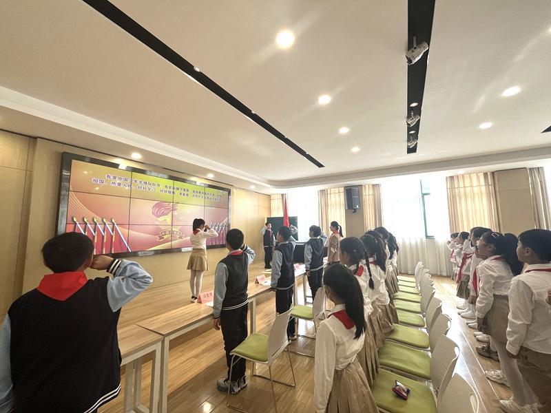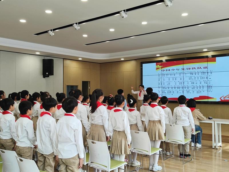 在铿锵有力的出旗曲中,全体师生庄严肃立,少先队员行队礼;伴随着激昂的旋律,队员齐声高唱《中国少年先锋队队歌》,用嘹亮的歌声表达对少先队组织的热爱,展现出新时代少年的蓬勃朝气与积极向上的精神风貌。