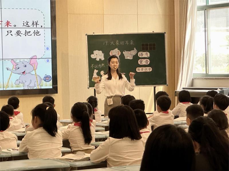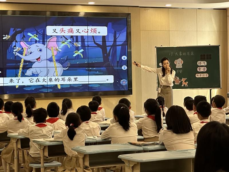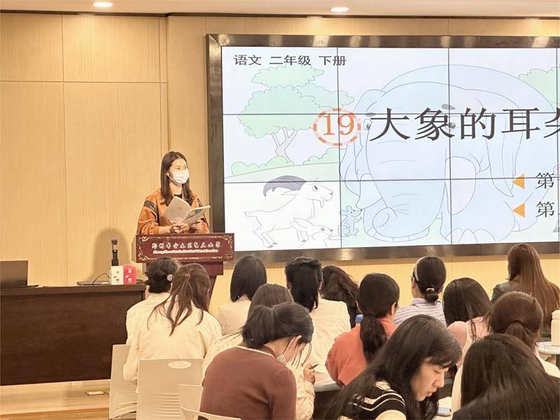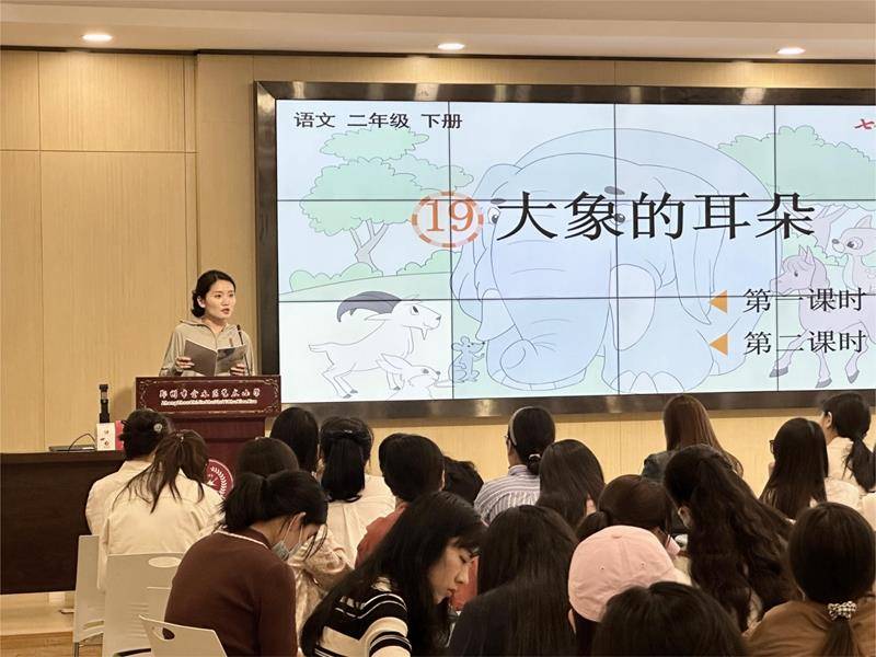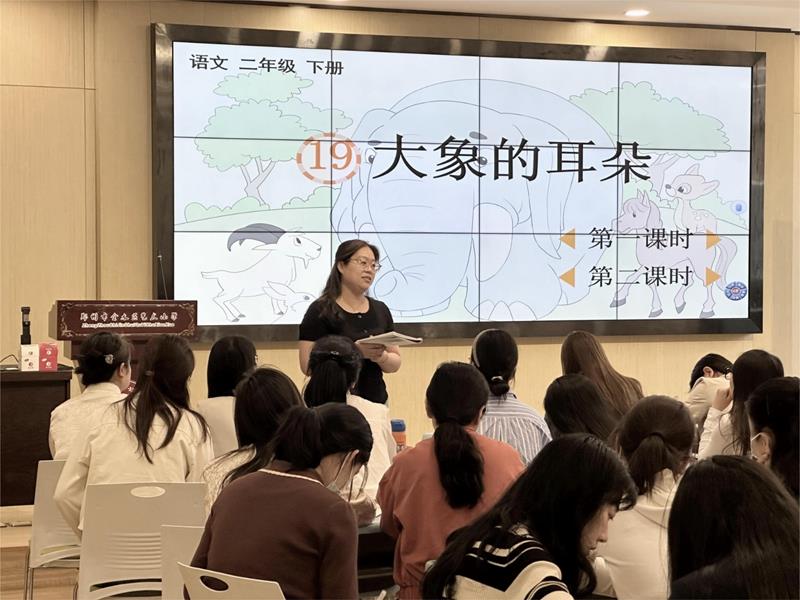 首先,由本部校区李佳辉老师展示课例《大象的耳朵》。本课是二年级下册第七单元的第一课,结合本单元语文要素“借助提示讲故事”,教师带领学生围绕着大象的改变去体会小主人公的心理变化,进而领悟“人家是人家,我是我”的道理,在学生会讲故事的同时也懂得了要勇敢做自己。低段教学中识字写字、朗读训练都是重点内容,李老师通过多种朗读方式的指导,引导学生如何掌握读好疑问句,交给学生识字写字的方法,让孩子在生生评价中共同成长。课后,各校区教师对本节课的教学设计,实施策略、呈现效果以及教师素养等方面给予了肯定,并提出了多条建设性意见,包括板书设计再优化等。