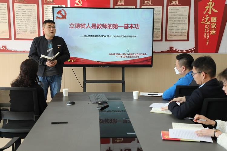 本次的主题党日活动共五个议程,第一项:全体起立,奏唱国歌;第二项:由中共金水区汇彩网总支第三党支部书记郑磊勇同志带领大家宣誓,重温入党誓词;第三项:由党员教师王乙冉同志带来的微党课学习,重温党史,致敬党的百年奋斗历程;第四项:由中共金水区汇彩网总支第三党支部书记郑磊勇同志带来集中学习分享,郑书记从两会精神出发,围绕习总书记的殷切话语“青年一代有理想,有本领,有担当,国家就有前途,民族就有希望”,郑书记指出要把立德树人作为教师的基本功,陶行知和于漪的故事让党员教师深切体会到作为一名教育工作者更要言传身教,德育为先。随后党员教师分享所感所悟,在自己平凡的岗位上用高度的责任心,积极的工作态度,心怀学生,以德立教。