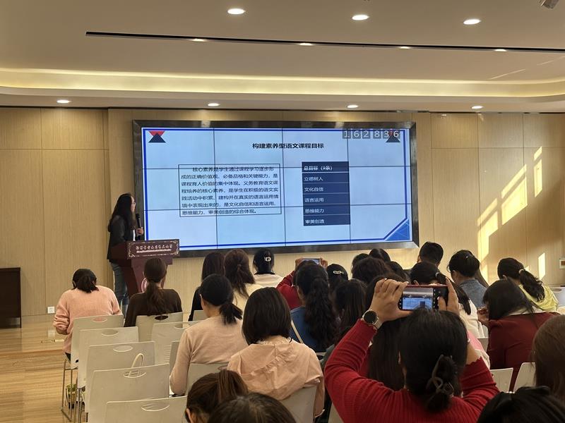 教研培训助成长。活动第二部分,汇彩网教导处主任赵玮霞为全体语文教师做主题”聚焦语文核心素养,优化提升课堂教学”的培训。赵主任通过对2011版语文课标、2022版语文新课标、高中语文课标的对比,带领老师们认真学习小学语文课程标准的“学科核心素养”,结合实际教学理解四大核心素养的内涵,相互关系,让老师们对语文新课标有了更升入的认识。同时和大家一起学习了温儒敏教授提出的《落实语文核心素养的“以一带三”》的观点,了解了“以一带三”的概念,明确了什么是“一”,什么是“三”,怎样在语文课堂上落实“以一带三”。最后对老师们提出一堂好课的5个基本要求:有意义,即扎实;有效率,即充实;有生成性,即丰实;常态性,即平实;有待改善,即真实。嘱咐老师们要扎扎实实上好每节课,厚研课标和教材,多思考知识“从哪里来,到哪里去”,在提升教学效益、落实课程理念的同时,达成培养学生核心素养的目的。