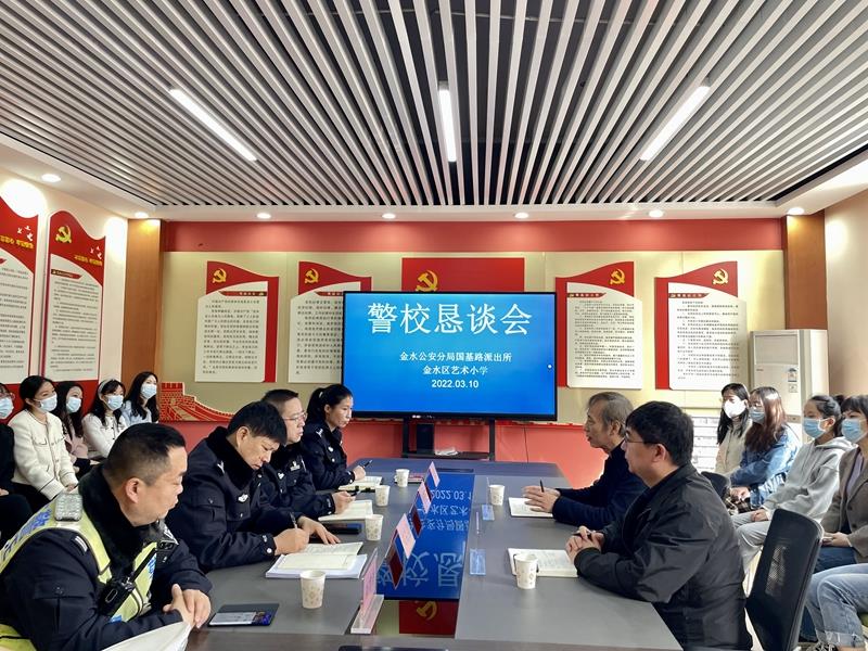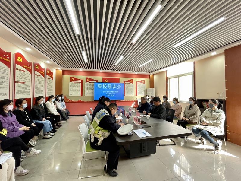 警校恳谈会由学校校长赵纪军及分管安全工作的副校长韦慧卿主持,教师代表参会。金水公安分局国基路派出所的民警结合安全方面事实案例,重点阐述了小学校园安全的现状、校园安全事故问责、校园安全事故的预防、校园安全事故的应急处理等,结合相关数据分析了小学校园中存在的事故类型及事故场所。