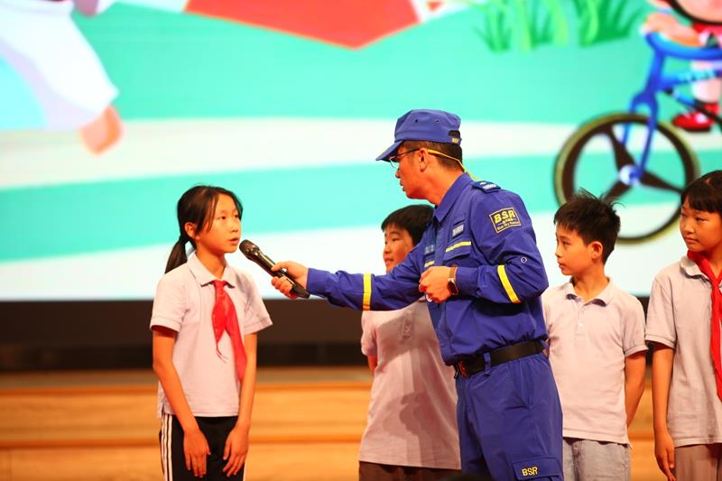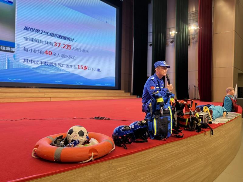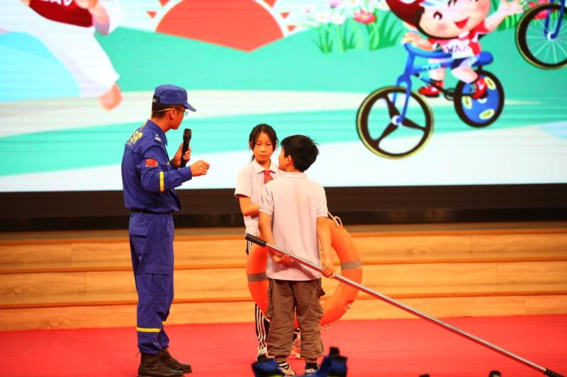 王伟及其队友还通过多媒体课件、现场演示等多种形式,形象直观地讲解了救生圈、救生衣的正确使用方法,溺水自救、互救方法,溺水后应急救护示范等,并利用仿真人讲解心肺复苏的现场操作过程,包括做好个人自我防护、判断伤者意识状态、确认伤者呼吸心跳、检查口腔是否有异物、打开气道方式、人工呼吸操作及胸外心脏按压的正确做法。“海姆立克”急救法的具体实施操作细节演示环节,同学们在平时获取知识的基础上,通过救援队员手把手的讲解,又得到了更为准确和实用的体验。特别是救生工具的正确使用方法激起了同学们浓厚的兴趣,纷纷举手积极参与,现场感受溺水、救援的全过程。