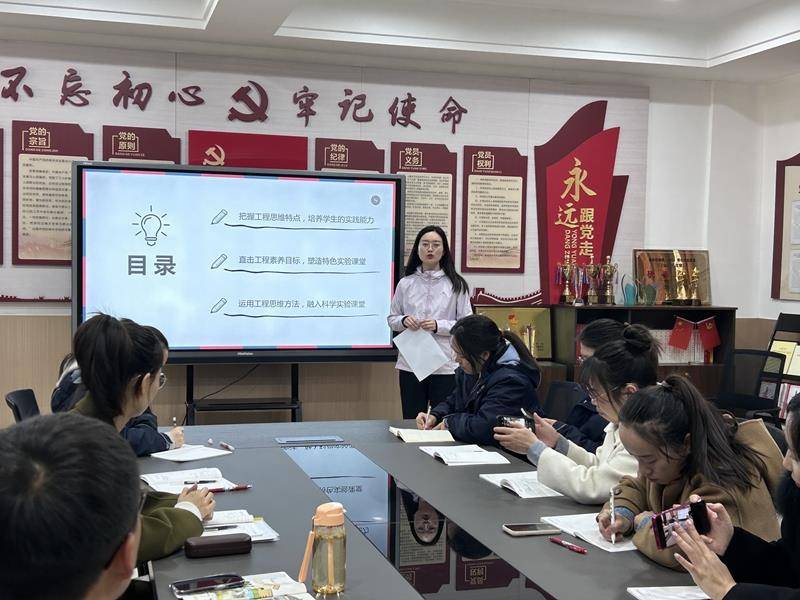 科学论证,思维再生。春水初生,桃花渐浓。3月20日,全体科学教师齐聚宏康校区,开展本学期第一次教研活动,潘玥老师结合自身的教学经验,以“科学论证式教学”为主题,向大家分享论证式教学方法在不同学段中的应用。随后宋淑娟老师结合课标,分析高段学情,围绕科学中的“工程思维”展开分享。教研最后,宏康校区教导处副主任姚媛提示大家,教有定法,学无定法,因材施教才能事半功倍。