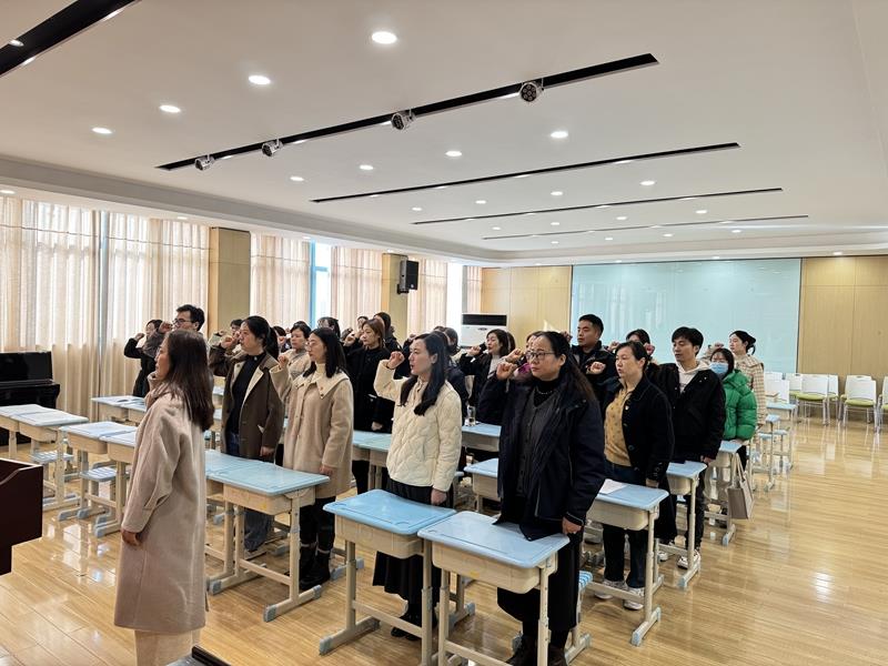 在交流研讨环节结束后,全体党员重温了入党誓词。大家庄严地举起右拳,面对党旗宣誓,表达了对党的忠诚和对教育事业的热爱。