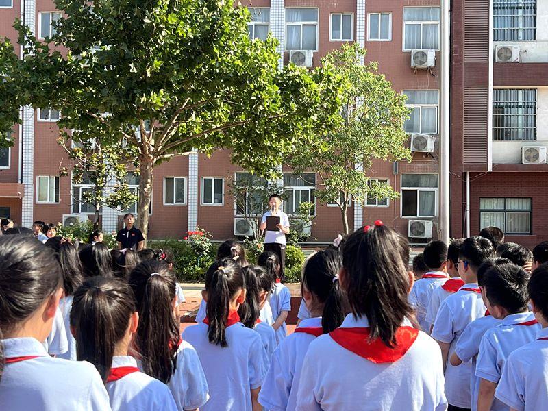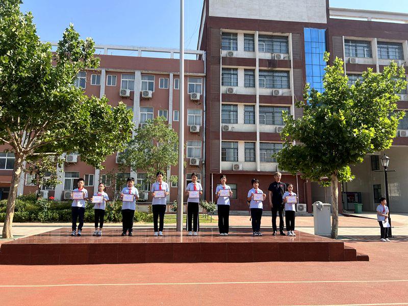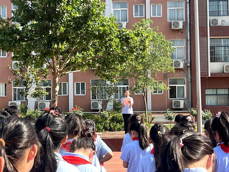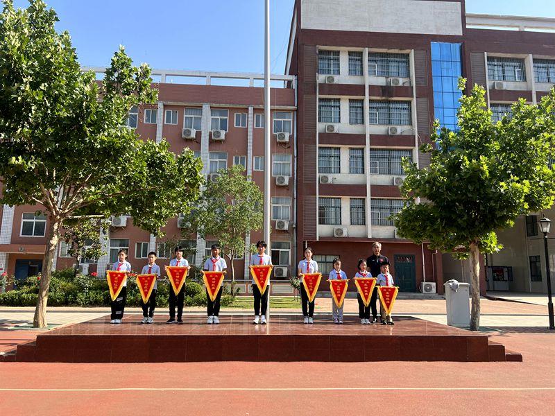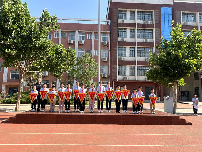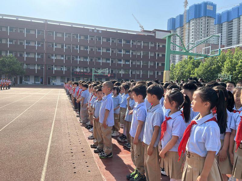 升旗仪式由学校五七班同学孟乐源主持。迎着朝阳,队员们迈着坚定有力的步伐来到国旗台前。随着国歌声响起,少先队员整齐地行队礼,用目光凝视着鲜艳的五星红旗缓缓升起,嘹亮的国歌声回荡在校园,回荡在每个人心间。