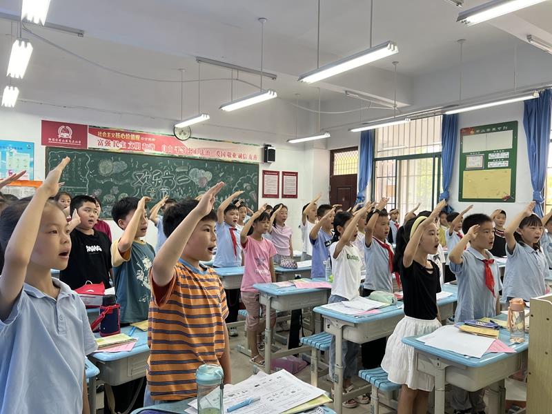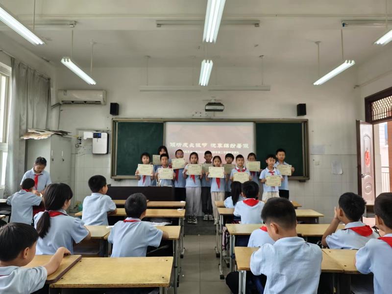 伴随着庄严的国歌声响起,散学典礼正式拉开帷幕。活动由学校优秀少先队员代表郭钇辰同学主持,学校少先队大队委李星阅同学进行国旗下演讲。演讲中,李星阅同学向伙伴们发出“过有意义暑假”的倡议,号召同学们:动静相宜,与好书相伴;坚持锻炼,与健康相伴;积极劳动,与创造携手;防范危险,与安全同行,度过一个快乐而充实的假期。