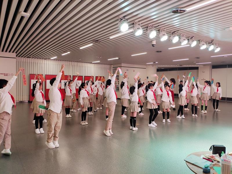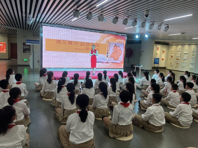 在河南博物院讲解员老师的带领下,队员们穿过门廊,来到河南博物院社会教育体验厅,观摩馆本研学课程《汉字童年--甲骨共舞》。中国传统文化传承了数千年,有一个特点就是“古汉字”“经典文章”以及“传统书法”三位并存,甲骨文最能体现汉字“三位一体”的特点,它象形、会意,像字又像画。在讲解员老师绘声绘色地讲解下,枯燥的文字渐渐生动起来,队员们不仅了解了甲骨文的历史渊源和特点,还饶有兴趣地跟随讲解员用身体来表演《甲骨操》,亲身感受祖先的智慧。除了表演甲骨操,队员们还分小组合作,充分利用粘土的可塑性,亲手制作甲骨文。只见略显笨拙的小手小心翼翼地操作,有的用笔书写,有的用剪刀剪,合力制做出一个个活灵活现的甲骨文字,并得意洋洋地把合作成果向伙伴们进行展示。