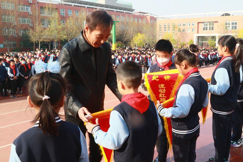 红领巾监督岗位的队员们坚持对学校各班卫生、纪律、大课间等方面进行有效的检查与评比,大队委公布获得“流动红旗”班级,学校党总支书记、校长赵纪军为获奖班级颁奖。我们相信:流动红旗不仅仅是荣誉,更是各班同学不断向上的精神追求和努力方向。