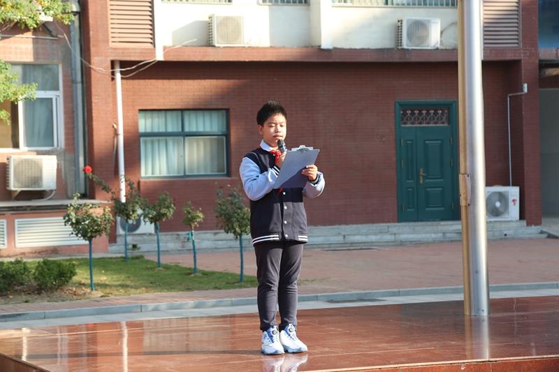 学校六七班学生代表胡字博进行国旗下演讲:在学校要做一名尊师守纪、积极向上的好学生;在家里要做一名尊老爱幼、体贴父母的好孩子;在社会要做一名明礼诚信、爱国守法的好公民;要常怀感恩之心,用实际行动向长辈们表达自己的心意。