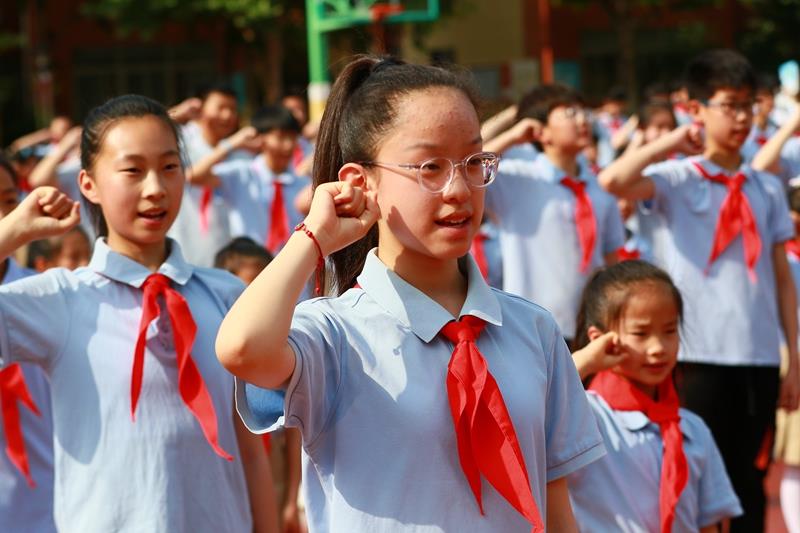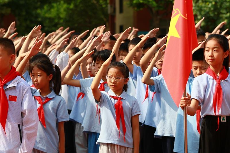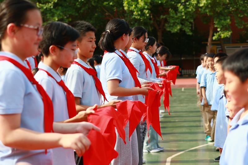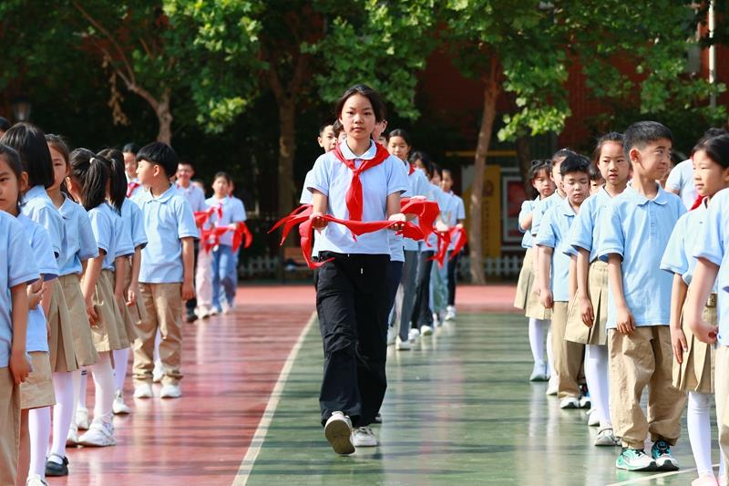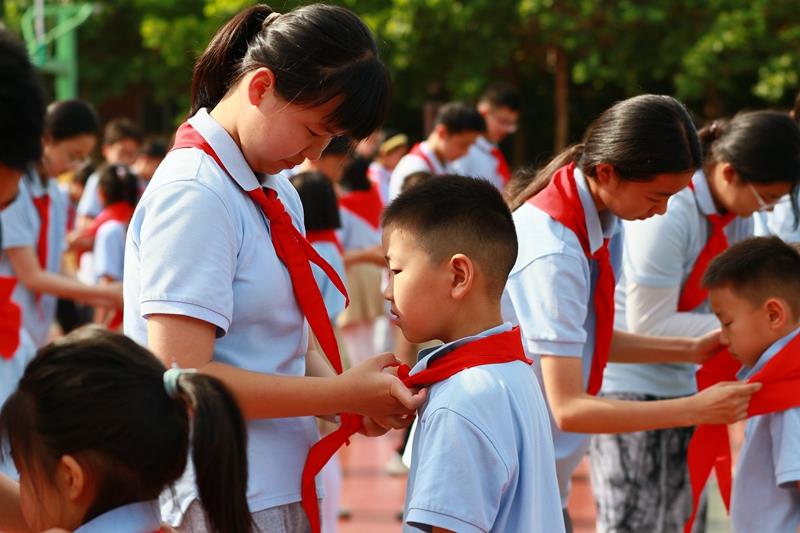 阵阵热烈的掌声中,六年级队员为新队员们佩戴上人生的第一条红领巾,并互敬队礼,传递着少先队员之间的友谊与责任。鲜艳的红领巾在新队员胸前飘扬,从此信仰有了颜色,便是这抹中国红!