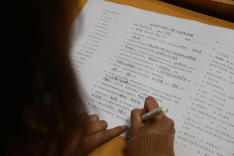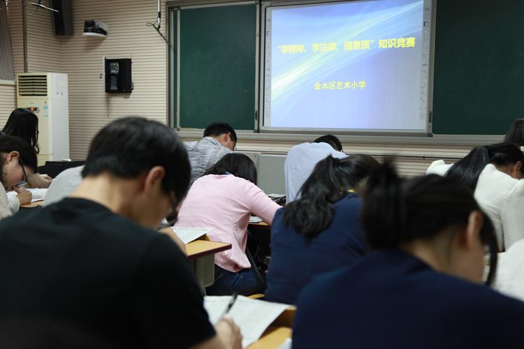 最后,全体党员教师围绕“学”开展了一次“学精神、学法律、提素质”知识竞赛,并认真完成金水区“两学一做”考试卷的答题。