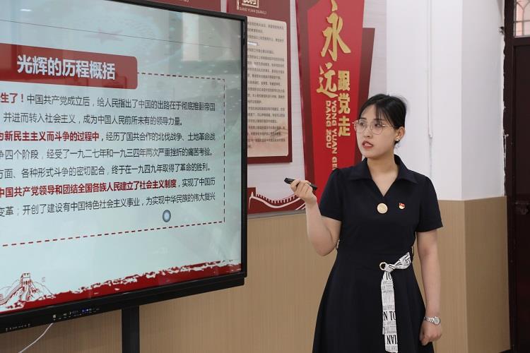 紧接着进行分享的是王星老师,王老师从我党的发展历程、伟大探索、中国特色社会主义等几方面进行阐述,通过一张张图片、一部部影像,深刻感受到中国共产党不愧是领导中国人民不断前进、不断开创新事业的核心领导力量。