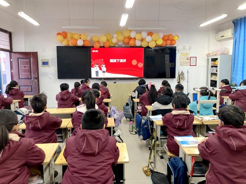 升旗仪式上,全体师生共同观看了学校举办的“读经典 我思考”经典诵读比赛中获奖作品展示视频,为获奖同学加油喝彩!