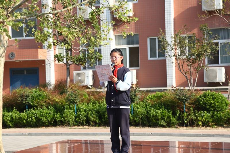 六八班张一涵同学进行国旗下演讲。她号召伙伴们:作为新时代的好少年,要有志向,爱学习、爱劳动,坚持品德为先,德智体美劳全面发展,肩负历史使命,努力成为堪当民族复兴重任的时代新人。