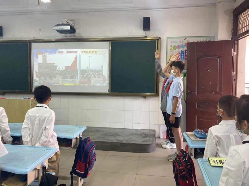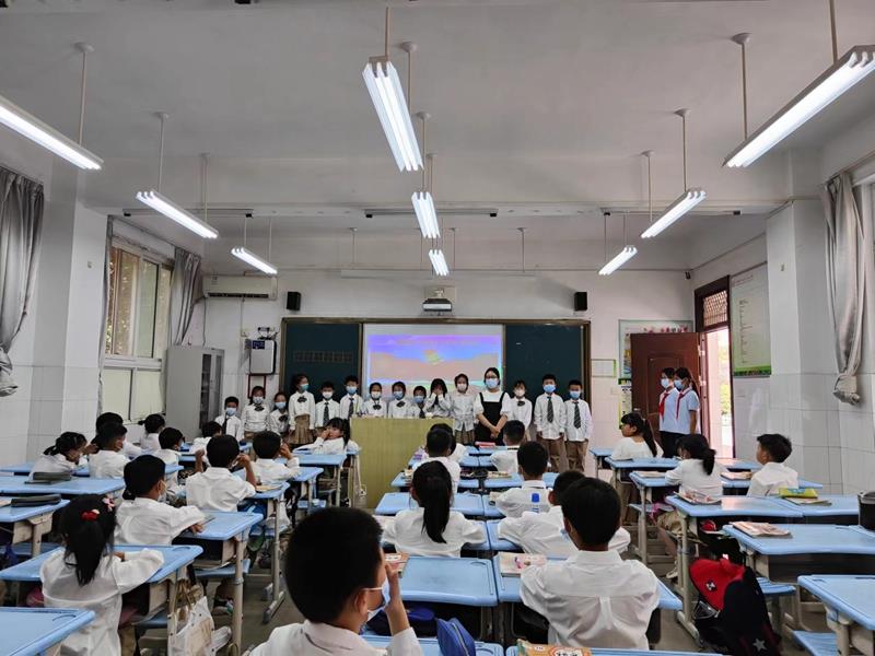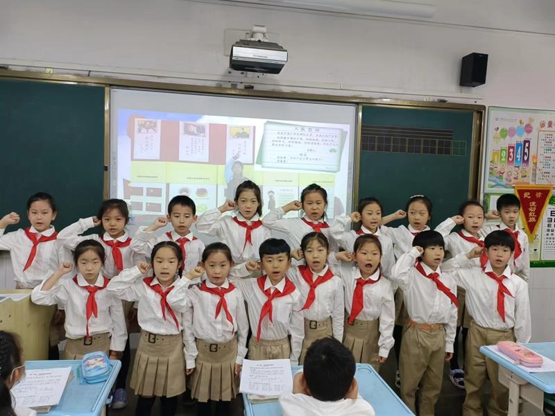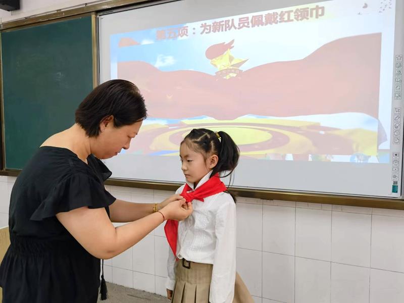 在激昂的《出旗曲》中,入队仪式拉开了序幕。全体一年级同学唱响《中国少年先锋队队歌》,仿佛在告诉革命前辈:小小的我们一定能做好共产主义接班人;随后,学校一年级各中队辅导员宣读此次入队的新队员名单,共有91名同学加入了光荣的少先队组织;伴随着积极阳光的《红领巾之歌》,六年级的老队员们代表和中队辅导员老师为一年级新队员佩戴红领巾,寓意着星星火炬,代代相传;在鲜艳的队旗下,大队长带领新队员庄严宣誓,童声琅琅,坚定有力!