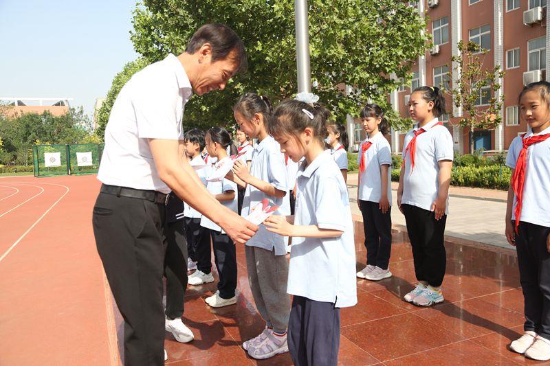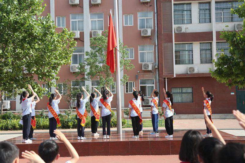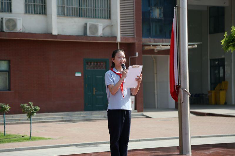迎着初升的太阳,鲜艳的五星红旗在铿锵有力的国歌声中冉冉升起,迎风飘扬,全体师生肃立注目,少先队员行队礼,齐唱国歌。
