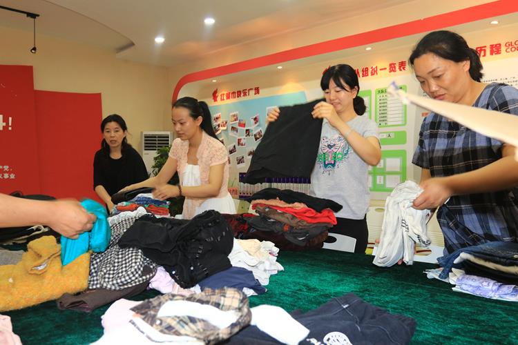 党员教师对旧衣物进行整理