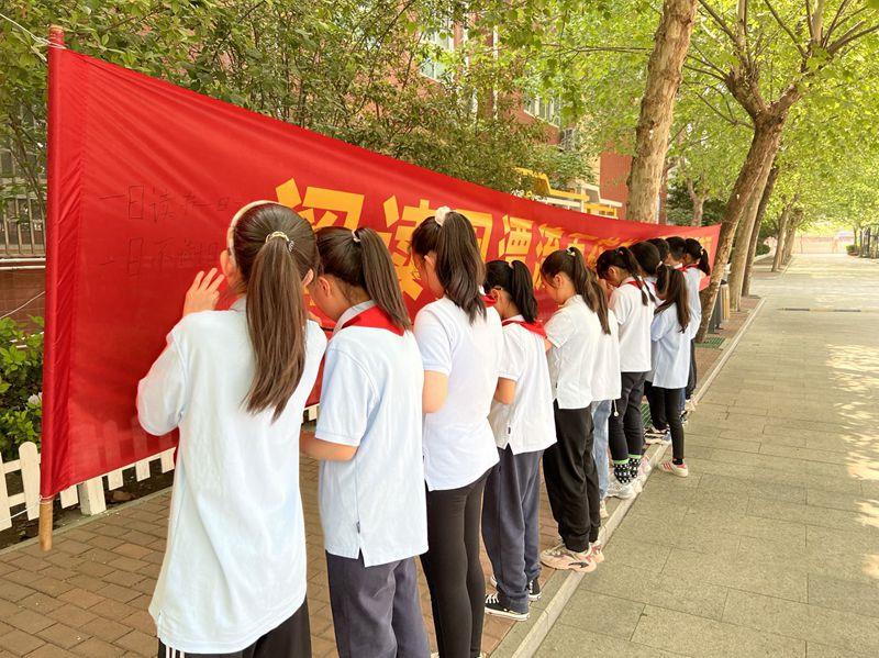 在学校梧桐大道上,同学们通过签名寄语的方式,以字传情,用最质朴的方式写下自己的心声。同学们的名字覆盖于主题条幅上,密密麻麻的签名构成了最美的画面,让无边的春色也尽在这飘满书香的校园里徜徉。