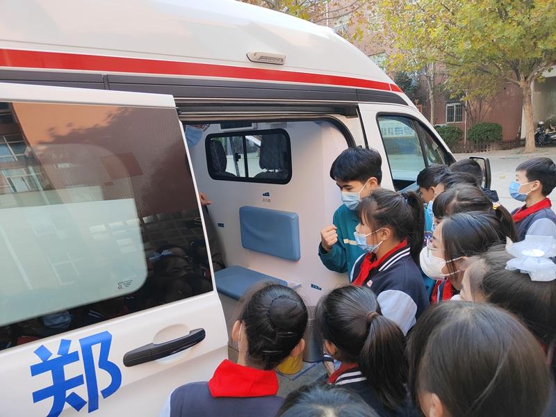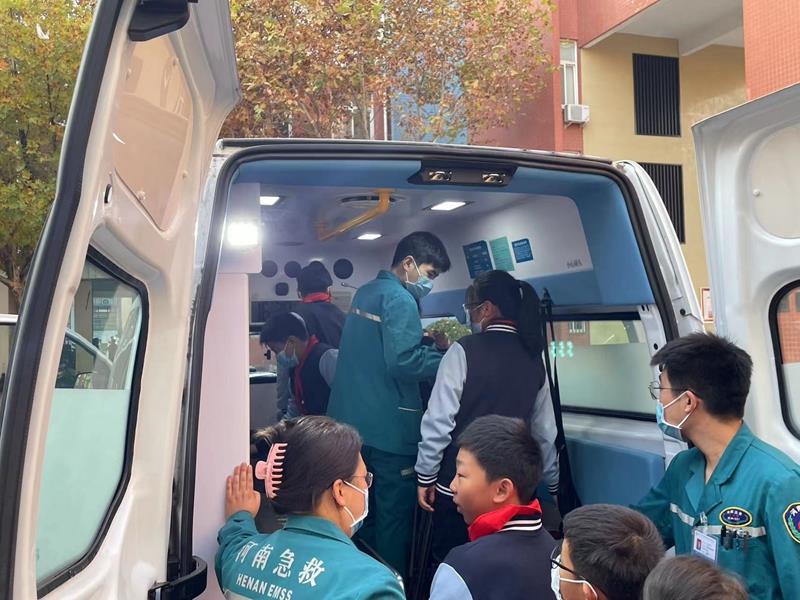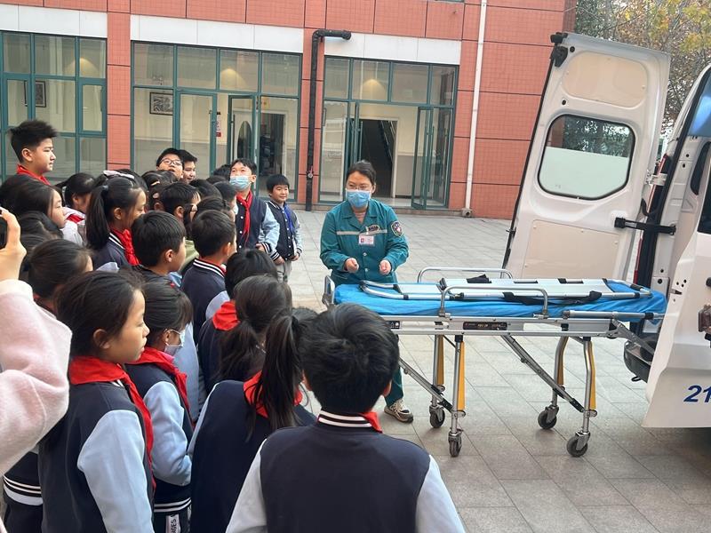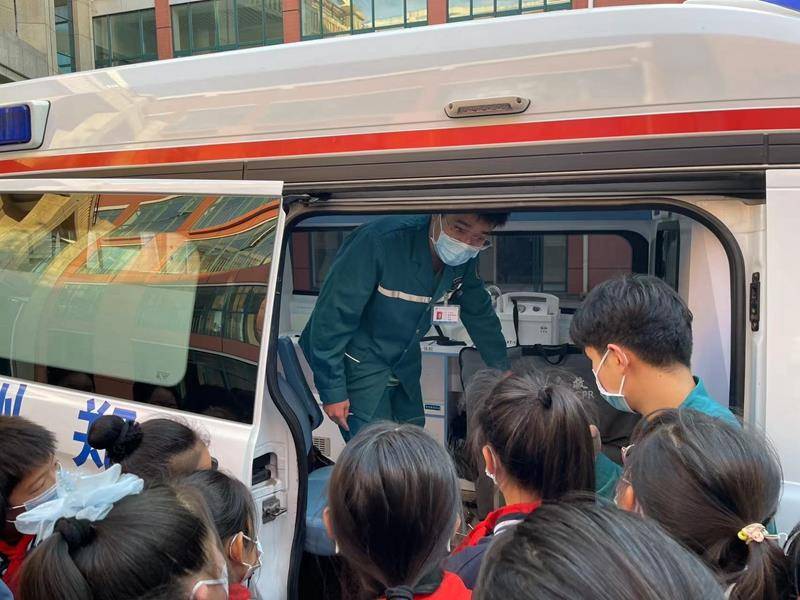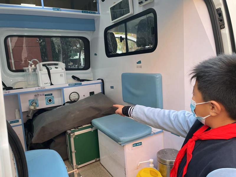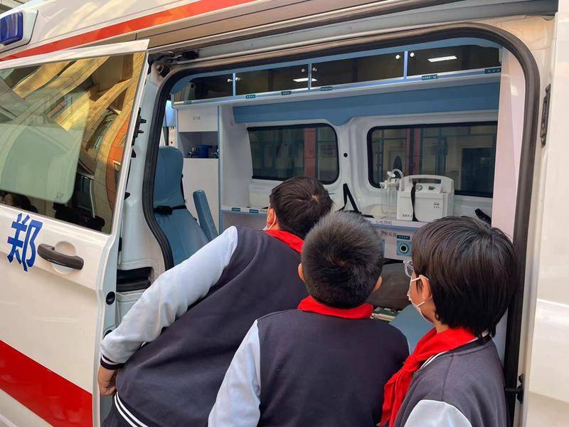 在学校枫丹广场上,同学们与120救护车来了一次“亲密接触”,近距离了解了救护车的功能,观摩了车内的仪器设备。医生们将专业的应急知识传授给在场的每一位同学,同学们积极参与互动,认识了转移梯、氧气枕、心电监护等设备,纷纷感叹:“哇,原来救护车里面是这个样子的!”
