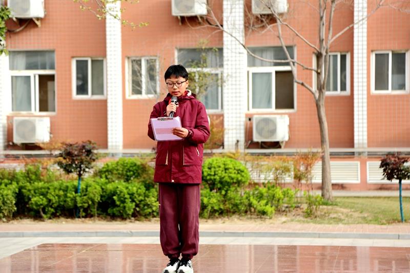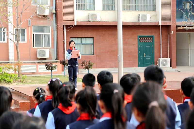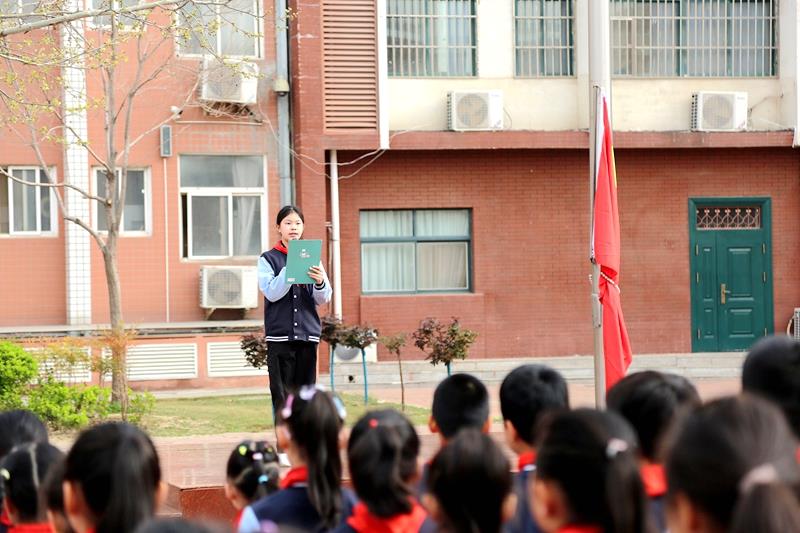 六七中队队员代表王馨怡同学进行国旗下的演讲。她用生动的语言,向伙伴们分享了自己和爸爸妈妈一起参加植树活动的有趣经历,并以自己作为六年级大姐姐的身份,呼吁同学们要积极带动身边人,和家人、朋友一起爱护每一棵花草树木,节约每一滴水,珍惜每一份资源。