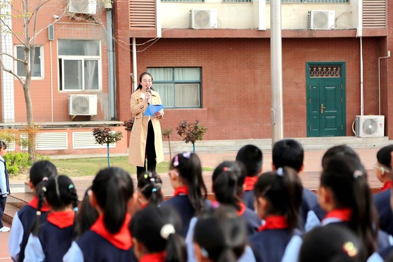 中队辅导员池梦飞老师发表讲话,她呼吁同学们培养环保意识,用实际行动为大地增添一抹新绿,绘就一幅生机勃勃的绿色画卷。在这个植树节,种下希望种子,收获美好未来,让绿色成为生活主调,让大自然永远生机盎然。