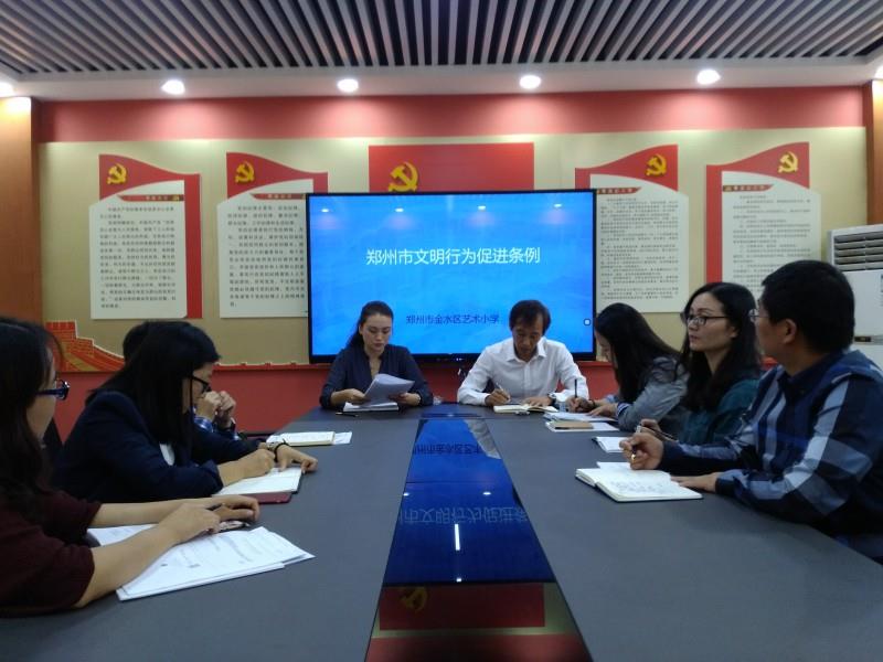 学校领导班子率先垂范,认真学习《郑州市文明行为促进条例》,按照学校实际情况,组织部署条例的贯彻落实。举行“讲文明,懂礼貌”主题升旗仪式,鼓励学生从日常小事做起,播种文明的行为,收获良好的习惯;播种良好的习惯,收获优秀的品格,倡导低、中、高年级的学生从生活小事做起,树立文明意识,践行文明行为。开展《我是文明小学生》的主题班会,让学生认识讲文明、懂礼貌的重要性。开展文明就餐、文明就寝活动,不争不抢文明有礼,节约粮食从我做起;进入寝室有序安静,随身物品摆放整齐。倡导全体师生文明入校,合理调整上学、放学的路队形式,制定学生接送方案,每天由学校中层带领值班教师,在学生上下学路上做好指引督导工作。