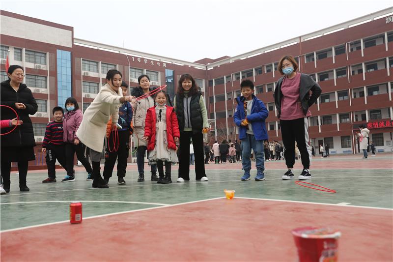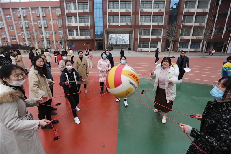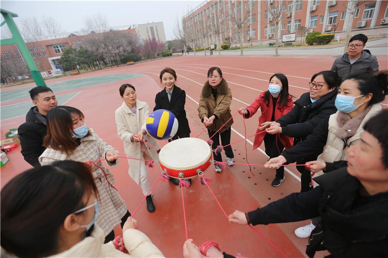 操场上开始了一场紧张有趣的运动会,首先是紧张激烈的“凝心聚力”项目,随着裁判的一声令下,一个个圆球在鼓面上翻飞,这个既需要敏锐的接球速度,又需要队员们齐心协力不让小球落地,阵阵欢呼声、加油声弥漫在校园上空;放松身心的“百发百中”项目,每名教师五个圆环,瞄准地上的各式各样奖品,看看谁的准头好,“瞄准、投”,在旁边加油的老师倒是比参赛者还兴奋,“哎呀,不中,再来”,每一位女教师都积极踊跃地参与游戏;列队传球,整齐的队列,小球在队员手中传递着,看看哪队最快;双人合体跑,腰里缠着布带齐心协力向前冲,整个活动现场气氛达到高潮……
