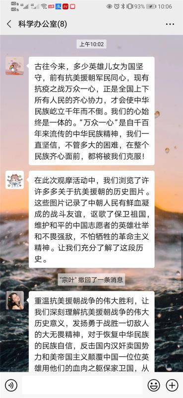 各教研组组织教师利用课余时间,集中观看《为了和平》纪录片,进一步激发了老师们的爱国热情,坚定了理想信念,在微信群中进行交流讨论,教师们纷纷表示,更加深刻的领会到伟大的抗美援朝精神的丰富内涵和时代价值,要继承和发扬革命英雄的伟大精神,用实际行动传承爱国主义的火种,为实现中华民族伟大复兴的中国梦贡献力量。