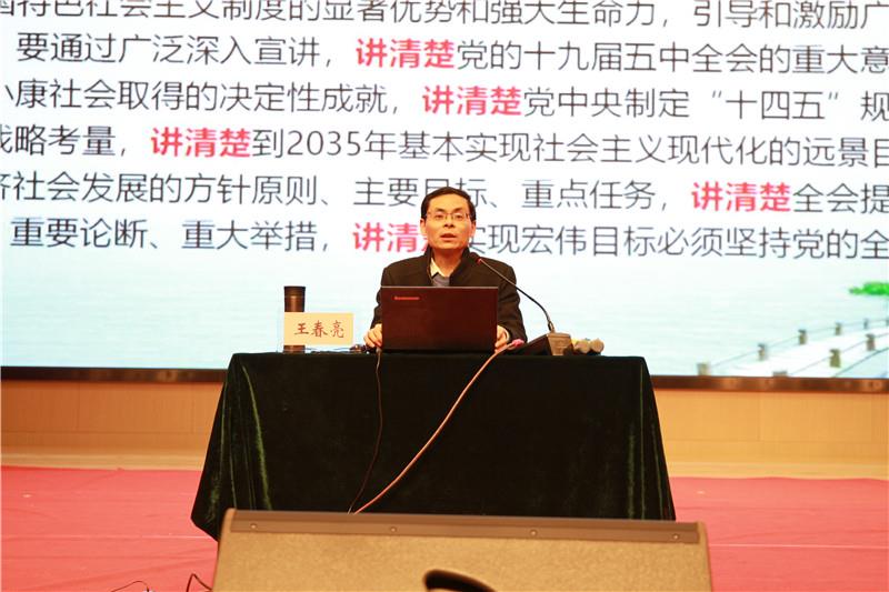 王教授详细介绍了当今国内形势和全球局势,从“一个主题”“二件事”“三个新”“四个全面”“五个理念”“六个主要目标”“九个远景目标”“十个决定性成就”和“十二个具体措施”,对十九届五中全会精神以及《中共中央关于制定国民经济和社会发展第十四个五年规划和二〇三五年远景目标的建议》进行了详细解读。王教授的讲授深入浅出,有理有据,接地气、提精神,一张张生动的图片和一个个精准的数据展示了中国共产党带领全体人民赢得的一项项胜利,创造的一个个辉煌,让全体党员教师对五中全会精神有了更加全面系统深刻的认识和理解。