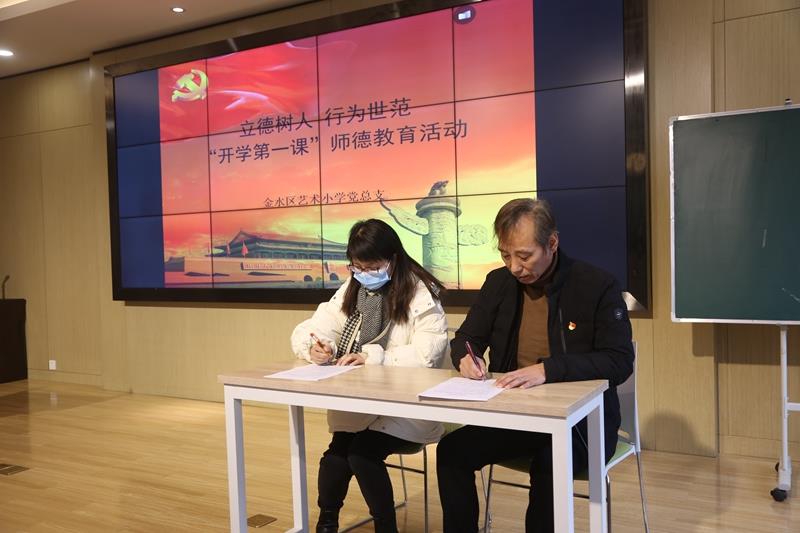学校赵纪军校长和教师代表张怡老师一同签订《师德师风承诺书》,会后每位教师的承诺书都将存入个人师德档案中。