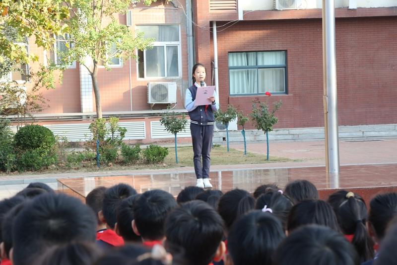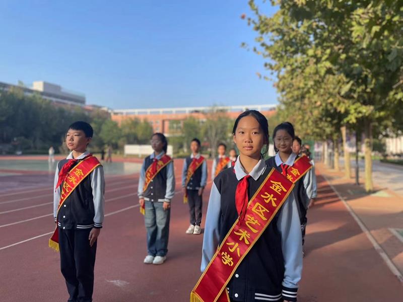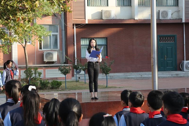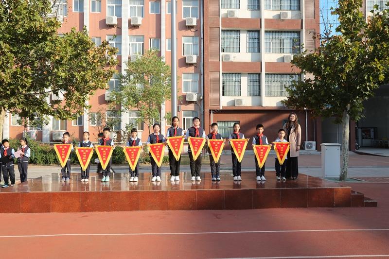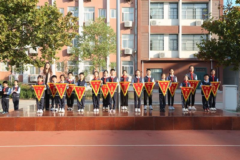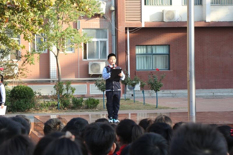 伴随着雄壮的国歌,庄严的五星红旗在全校师生的注目下冉冉上升,标准的队礼表达着少先队员对祖国深深的敬意。