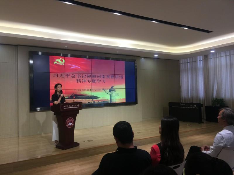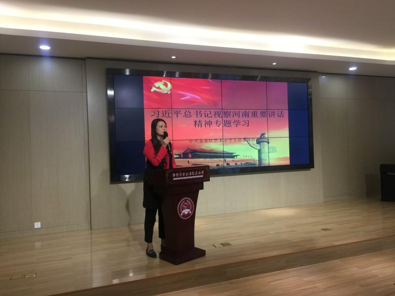 党支部副书记郭莹首先介绍了习总书记视察河南的考察调研情况,讲述了习总书记到信阳、郑州等地,深入革命老区、农村和企业,指导地方发展和第二批“不忘初心 牢记使命”主题教育开展。习近平强调,开展“不忘初心、牢记使命”主题教育,党员、干部要多学党史、新中国史,自觉接受红色传统教育,常学常新,不断感悟,巩固和升华理想信念。习总书记对河南各项工作取得的成绩给予肯定,希望河南广大干部群众,坚定信心,埋头苦干,以优异成绩迎接新中国成立70周年,努力创造出无愧历史、无愧时代、无愧人民新的更大的业绩。会上,副校长韦慧卿领学了习总书记重要讲话精神,常秀丽书记对主题学习教育活动提出了具体的要求。