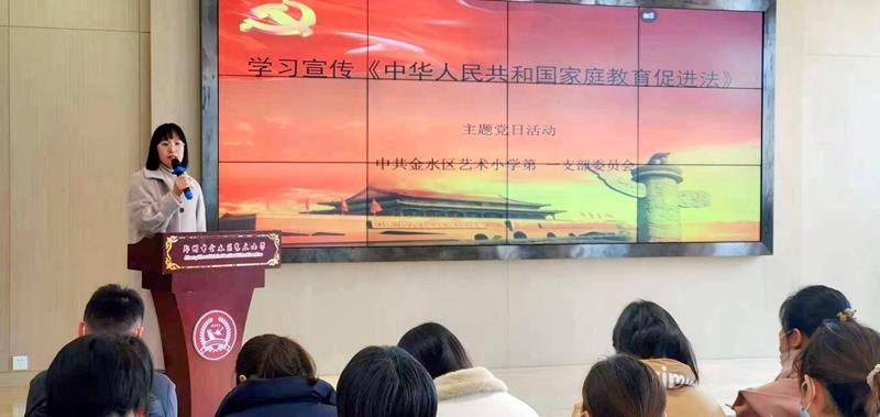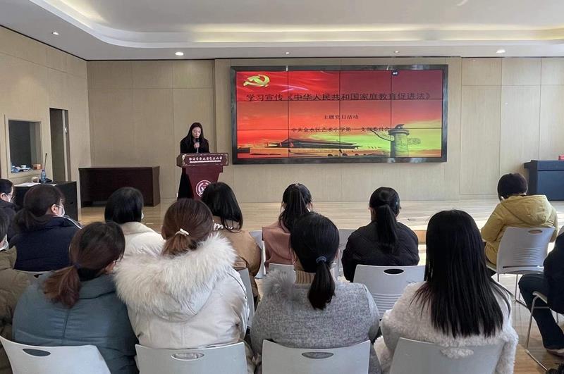 12月21日上午,汇彩网第一党支部在学校小演播厅组织召开本月主题党日活动,专题学习《中华人民共和国家庭教育促进法》,全体党员教师参加活动。