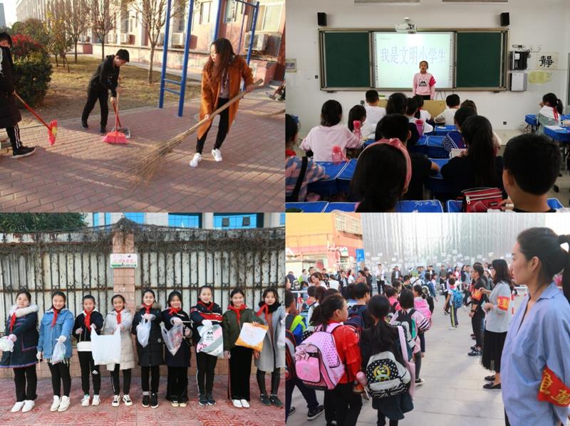 引领教师身为示范,引导学生传承美德,致力于学生良好行为规范的养成。举行“讲文明,懂礼貌”主题升旗仪式,鼓励学生从日常小事做起,播种文明的行为,收获良好的习惯;开展《我是文明小学生》主题班会,让学生认识讲文明、懂礼貌的重要性。开展文明就餐、文明就寝活动,不争不抢文明有礼,节约粮食从我做起;进入寝室有序安静,随身物品摆放整齐。倡导全体师生文明入校,合理调整上学、放学的路队形式,制定学生接送方案,每天由学校中层带领值班教师,在学生上下学路上做好指引督导工作。在“jing”活动基础上,从12月中旬开始,每周一下午分年级开展“垃圾不落地 校园更美丽”实践活动,由老师带领学生对校园内的纸屑垃圾进行捡拾和清理。活动中,老师拿起扫把同孩子们一起清洁校园,指导学生把垃圾拾起并分类投放。孩子们从老师身上学会了树立文明意识,以自己的实际行动,让校内外环境变得更美丽。