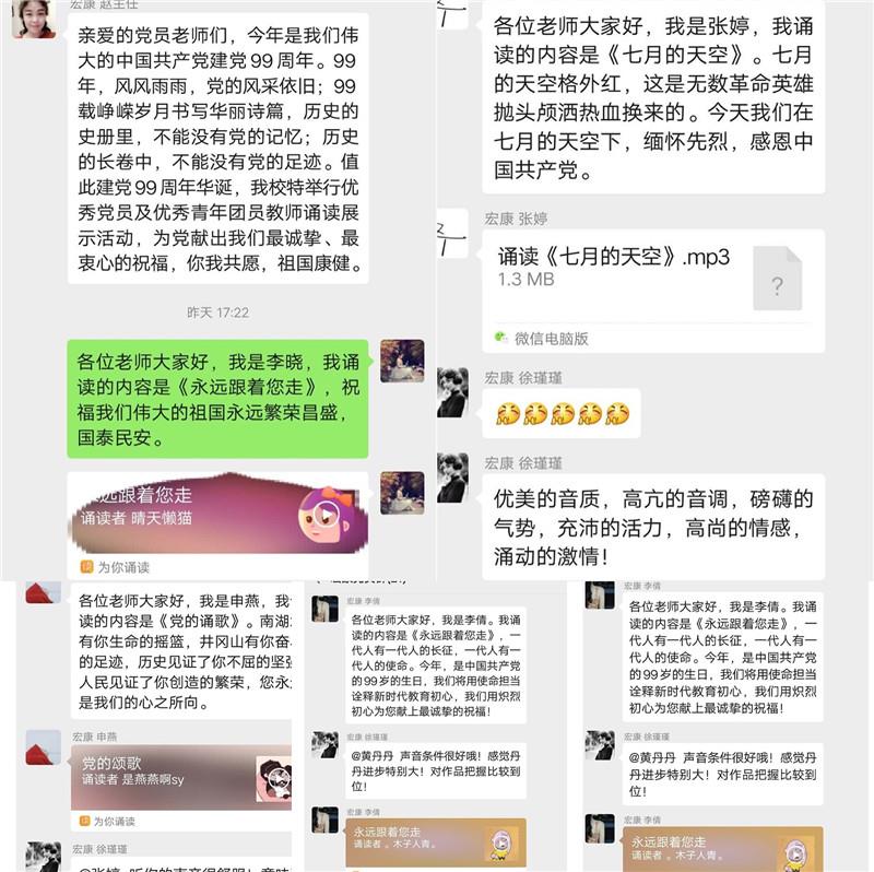 举行线上爱党爱国诵读展示活动,朗诵《党的颂歌》《永远跟着你》《七月的天空》等作品,党员们用铿锵有力的语言歌颂党的伟大,表达对党无限的热爱之情。退休老党员们结合线上和线下的形式,举行“礼赞新时代 颂歌献给党”歌咏比赛,14名在职和离退休党员教师自编自演合唱《没有共产党就没有新中国》《国际歌》《歌唱祖国》《党啊!我亲爱的妈妈》《小草》《唱支山歌给党听》和诗朗诵《七一感言》,用嘹亮的歌声向党的生日献礼,用深情的朗诵表达了为党的事业奋斗终身的决心和愿望。
