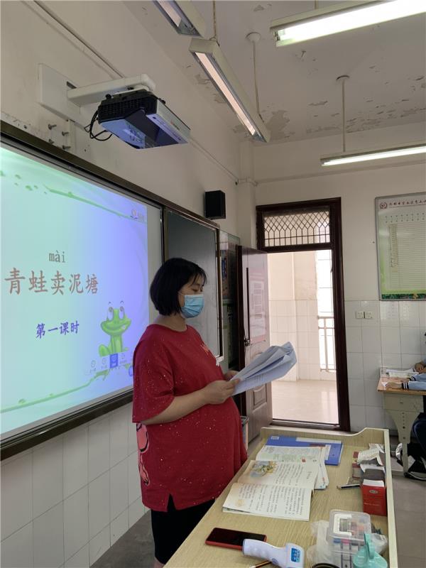 5月11日复学时,距离邢燕老师的预产期只剩一个多月,她没有向学校提出任何困难申请,没有提出疫情可能带给她的潜在危险,也没有提出自己身体不便带来的工作压力,如期返回学校的班主任工作岗位。如今,学生正式复学两周有余,预产期越来越近,她每天挺着大肚子,奔波在家庭和学校之间,穿梭于教室和办公室之中,身体越来越臃肿,步履越来越蹒跚,然而怀孕的辛苦丝毫没有影响她对工作的认真负责。她依然坚守在教学一线,每天早上不到七点半就来到学校,开始准备一天的晨检和教学准备。每天按时为学生测量体温、填写班级管理登记表,陪伴学生就餐、就寝,认真上课、备课、批改作业,认真辅导学生,她不喊苦不喊累,认认真真地完成每一项工作。她每次上完课后都会体力不支,但也从未让同事们看到她孕吐作呕、腰酸背痛的样子,而是依然坚守自己的岗位。