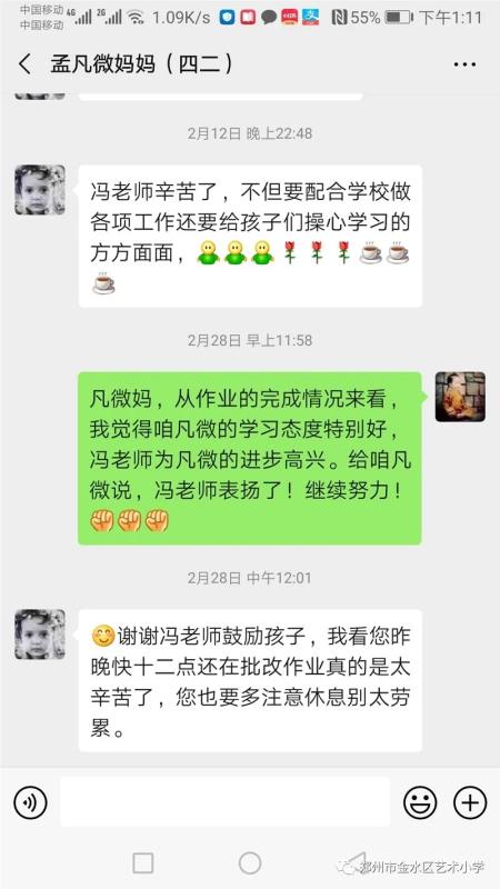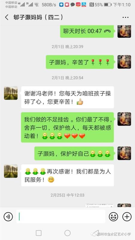 “疫情面前,没有局外人。”冯老师除了按要求上好直播科的同时,还给给孩子们播放疫情视频,让学生了解疫情当前的人间大爱,对自然心存敬畏、对善良常怀感恩,用积极地心理疏导培育学生健康心态,用正确的价值观引领增强学生社会责任感,培养孩子们的家国情怀和感恩之心。冯老师用心爱着班上的每一个孩子,更用行动关心着身边每一个人。她给在医院工作的家长朋友,一一发去信息,送去问候,班上郇子颢妈妈是郑州市人民医院的护士,工作在抗击疫情的一线,冯老师和子颢妈妈深入沟通,用电波中的声音和微信上的文字传递关心与支持。她用坚定信念践行着共产党员的奉献情怀,用实际行动诠释着特殊时期教师的责任与担当。