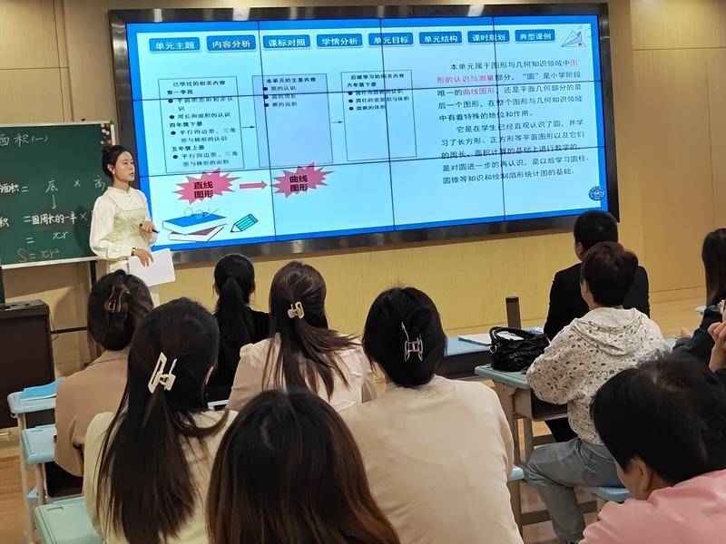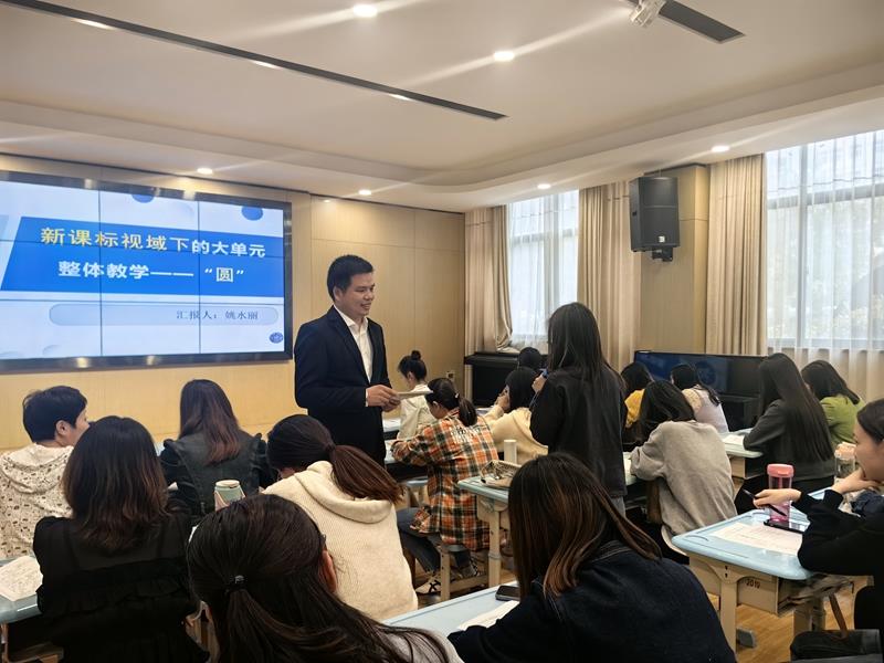 课后,在教导处葛金金主任的主持下,全体数学老师开展了深入的研讨活动。姚水丽老师先阐述了设计思路,并对本节课的呈现进行了自我剖析。接着,刘英杰老师结合这节课的呈现进行了单元整体课程设计的实施指导,并对姚老师提出的困惑进行了详尽的解答。