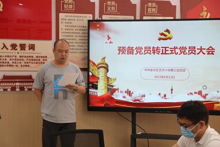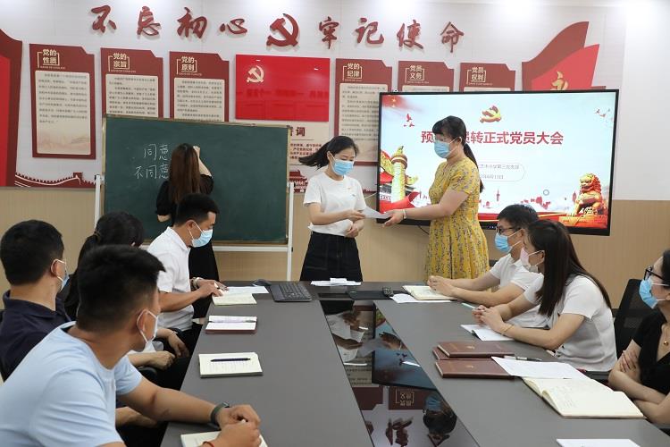 为进一步加强党员队伍建设,增强党员队伍生机与活力,6月13日上午,金水区汇彩网第三党支部于党建室开展接受预备党员转为正式党员大会,本次活动由学校第三支部书记郑磊勇同志主持,全体党员教师参与。