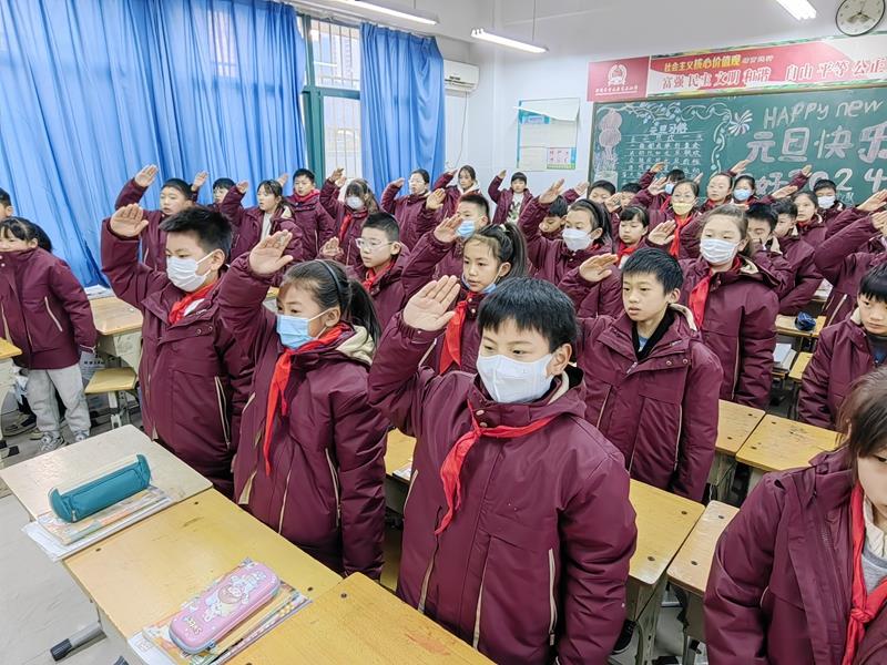 升旗仪式由学校六一班刘子宁同学主持。伴随着激昂雄壮的《义勇军进行曲》,全体少先队员将手高高地举过头顶,用响亮的歌声向鲜艳的国旗、向伟大的祖国敬礼。
