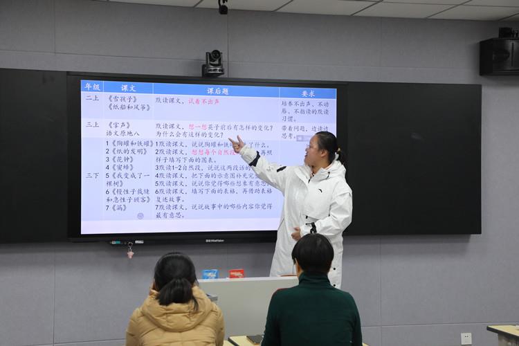 课例展示后,分别由低段和中段的两位老师进行汇报。李玉婷老师和袁芳芳老师分别结合两节课例,如何在课堂中落实语文要素,对课标进行梳理,找出其逻辑关系,进行汇报。
