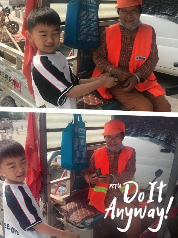 科豆们包好的粽子放进袋子里,送给环卫工人。