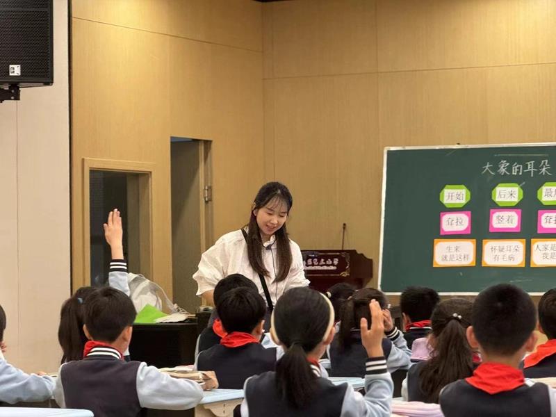 活动中,秦露老师以其深厚的专业素养,为大家带来了一节精彩的课例展示——《大象的耳朵》。秦老师紧密结合二下第七单元的单元要素“借助提示讲故事”,通过生动的课堂设计和丰富的教学手段,成功吸引了学生的注意力。她巧妙地运用自身的阅读优势,引导学生深入文本,感受故事的魅力。为了帮助学生更好地理解汉字,秦老师通过视频演示“舞”字的舞动之美,用扇子模拟“扇”字的动作,这些新颖有趣的方式极大地激发了学生识字认字的兴趣,为他们打开了识字的新世界。