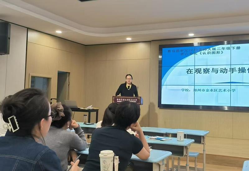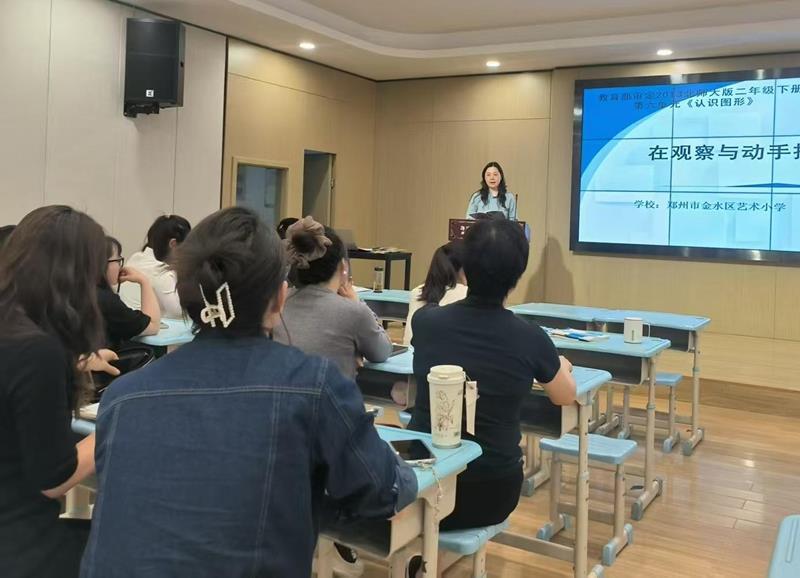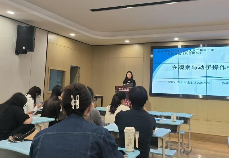 课后,二年级教研组长符菏老师带来了《在观察与动手操作中学习》的主题分享。符老师紧密结合课标要求,以“认识图形”这一单元的学习目标为出发点,深入剖析了学情,详细分享了课前研讨的实施策略以及所取得的实践效果。
